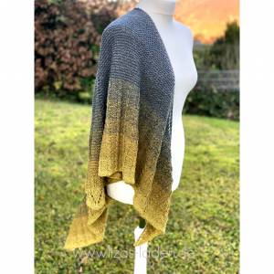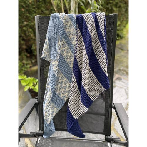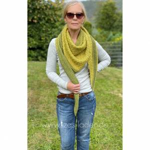 Dies ist eine Anleitung für ein leicht asymmetrisches Dreieckstuch, das aus drei Kontrastfarben gestrickt wird, um den Color Blocking Effekt zu erhalten. Verwendet werden zudem zwei verschiedene Garne. Die genauen Angaben zu den verwendeten Garnen und auch die Farbnummern finden Sie in der Anleitung. Insgesamt werden für das Tuch 1240 m verarbeitet.