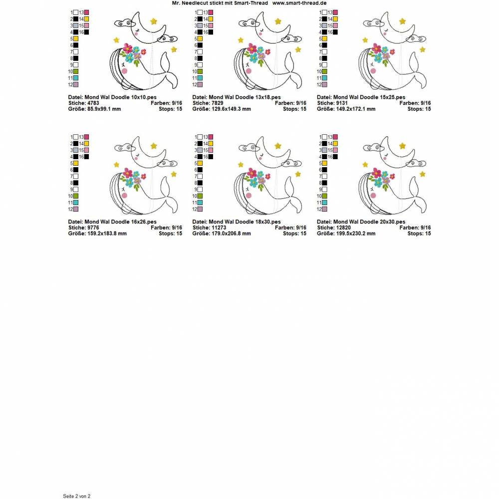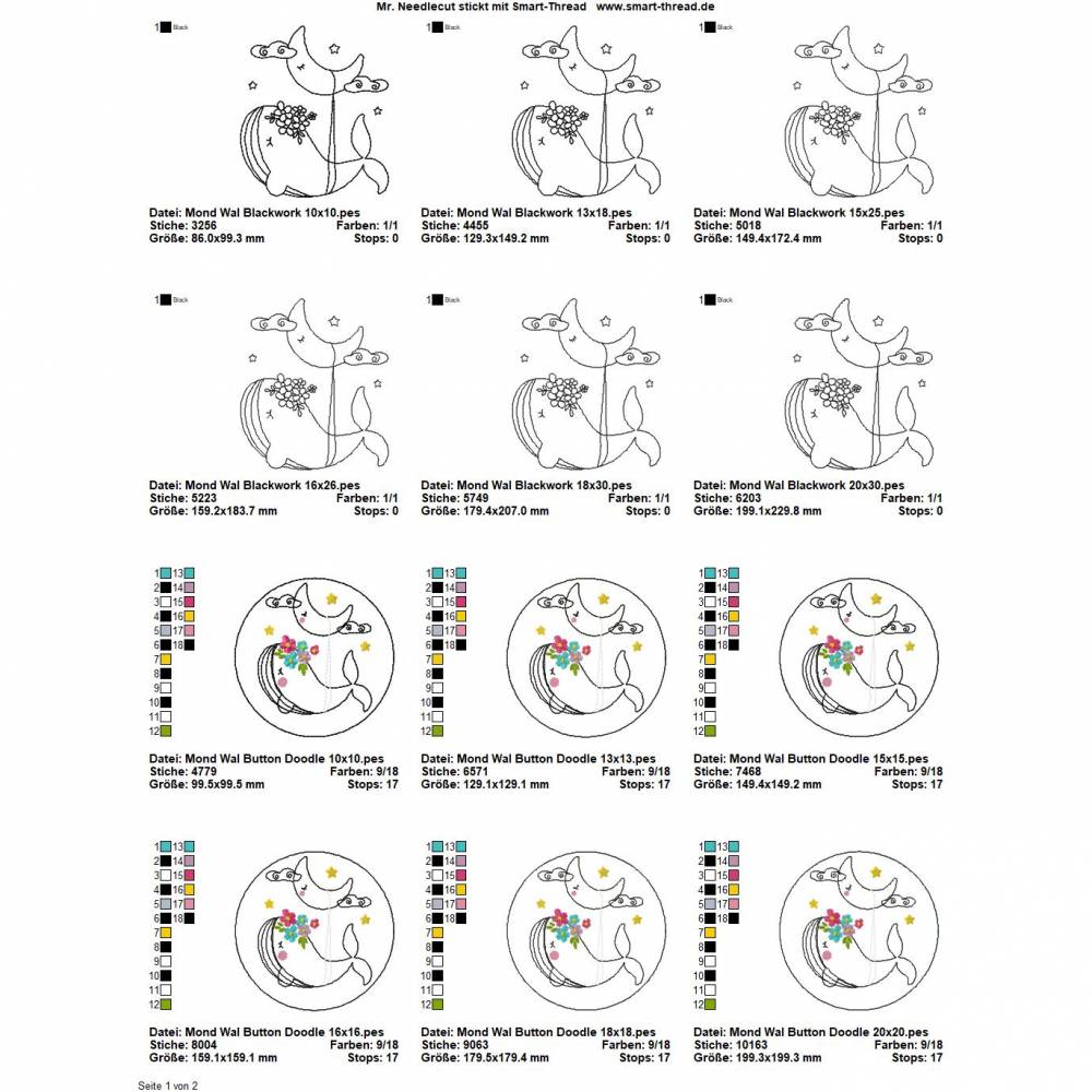Die genauen Größen und die Stichanzahl der einzelnen Dateien findet Ihr in der Farbansicht bei den Vorschaubildern.