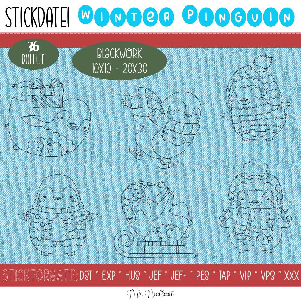 Digitale Stickdatei Winter Pinguin Blackwork für den 10x10 - 20x30 cm (4x4 - 8x12") Stickrahmen