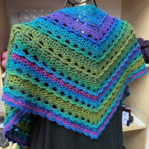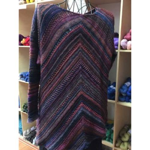 Für das abgebildete Originalmodell wurde Schoppel Zauberball Crazy verwendet, die Colorways-PonchoJacke kann aber auch aus einem anderen Farbverlaufsgarn vergleichbarer Stärke nachgearbeitet werden.