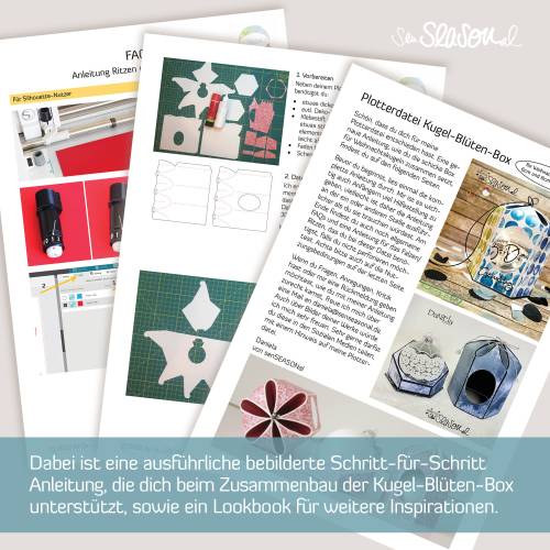 Die Dateien sind für das Plotten mit Papier ausgelegt. Du erhältst mit der Datei eine umfangreiche Anleitung, die dich Schritt für Schritt unterstützt, die Süßigkeiten- oder Ringbox herzustellen. Du erhältst die Schneidedateien in SVG und DXF. Der Datei liegt ein Lookbook bei mit einigen Inspirationen für Umsetzungen.