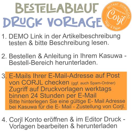 Bitte beachte, dass bearbeitbare Templates (Vorlagen, welche mit Corjl bearbeitet werden) nicht automatisch zum Download verfügbar sind. Diese Bestellungen werden manuell bereitgestellt und haben eine Zustellzeit von bis zu 24 Stunden. Vielen Dank für Deine Geduld und liebe Grüße, Sandra