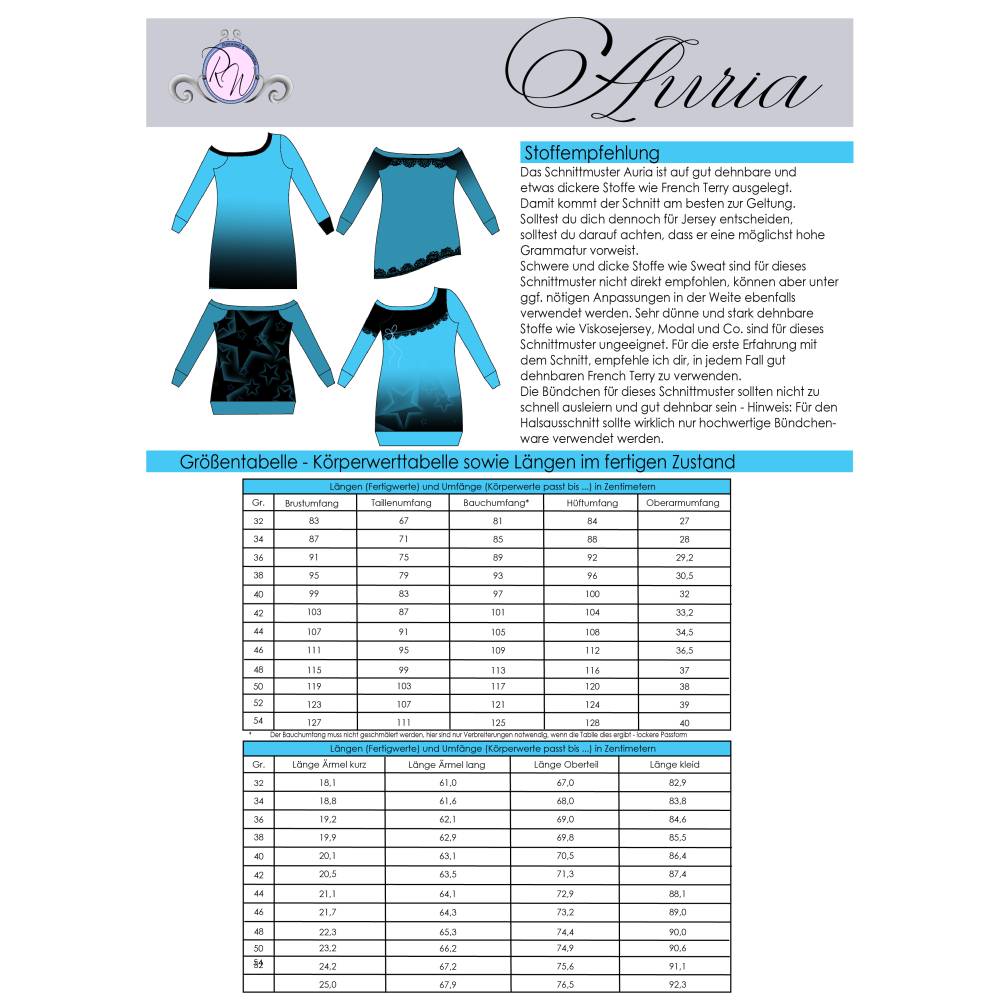 Hinweis: Das Schnittmuster enthält weder Naht- noch Saumzugabe und ist auf eine Körpergröße von 164-165cm ausgelegt. Im Schnittmuster enthalten sind die Nähgrößen 32 bis 54. Auria ist auf weichen, gut dehnbaren French Terry oder Jersey mit höherer Grammatur ausgelegt. Bündchenware ist vor allem beim Halsausschnitt zu verwenden. Einfache Anpassungen sind im Ebook beschrieben. In den Dateien findest du die A4-Versionen zum Ausdrucken, eine Großdruckdatei sowie die Beamerdatei - alle Dateien inkl. Ebenen zum Ein- und Ausblenden der Größen.