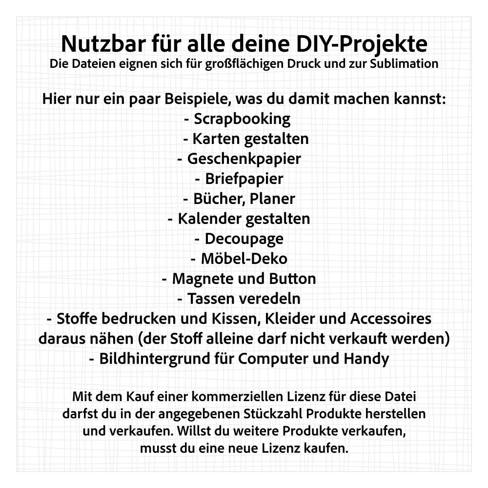 Das digitale Endlosmuster kannst du nach dem Kauf auf deinen Computer herunter laden. Die Musterkachel kannst du mehrfach aneinander setzen und so das Muster für deinen persönliches Bedarf erstellen, es auf Papier ausdrucken und mit deinem DIY-Projekt loslegen, oder damit zum Beispiel Tassen veredeln oder Stoff bedrucken lassen, um daraus Kissen zu für dein Zuhause zu nähen. Ebenso kannst du meine Muster als Bildschirmschoner auf deinem Laptop oder Smartphone nutzen, Bucheinbände und Journals damit gestalten.